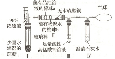 7.D[提示:A.蔗糖遇到浓硫酸变黑,是由于浓硫酸具有脱水性,将蔗糖中氢原子和氧原子按水的比例脱出,不是吸水性,故A错误;B.a棉球褪色,体现二氧化硫的漂白性,b棉球褪色,体现二氧化硫的还原性,故B错误;C.无水硫酸铜变蓝,证明有水,但是蘸有品红溶液和稀溴水的棉球中都有水,不能确定使无水硫酸铜变蓝的水是否由反应产生,故C错误;D.Ⅲ中溶液颜色变浅,是因为有二氧化硫,不褪色说明二氧化硫反应完全了,Ⅳ中澄清石灰水变浑浊,说明产生了二氧化碳气体,故D正确。]