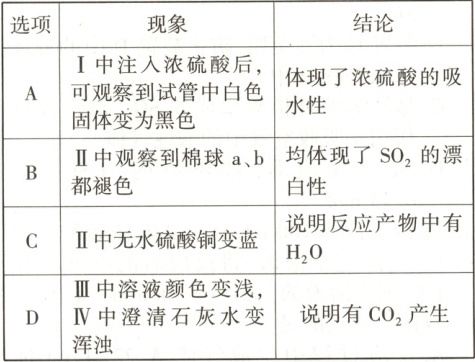 7.【题型一】某同学设计了蔗糖与浓硫酸反应的改进装置,并对气体产物进行检验,实验装置如图所示。下列结论中,正确的是 (