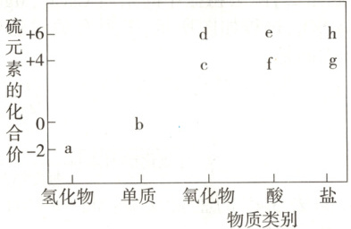7.A[提示:根据硫的价-类二维图,a是$\mathrm{H_2S}$、b是S、c是$\mathrm{SO_2}$、d是$\mathrm{SO_3}$、e是$\mathrm{H_2SO_4}$、f是$\mathrm{H_2SO_3}$、g是亚硫酸盐或亚硫酸氢盐、h是硫酸盐或硫酸氢盐。A.$\mathrm{H_2S}$中氢元素处于最高价,有氧化性,故A错误;B.根据归中反应规律,单质硫与浓硫酸可反应生成$\mathrm{SO_2}$,故B正确;C.酸雨中含有$\mathrm{H_2SO_3}$,放置过程中$\mathrm{H_2SO_3}$会被氧气氧化为强酸硫酸,故C正确;D.硫酸可与亚硫酸盐或亚硫酸氢盐反应生成具有刺激性气味的$\mathrm{SO_2}$,故D正确。]