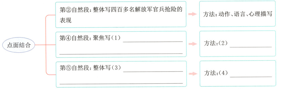3.(1)解放军某部四连连长黄晓文的英勇表现(2)动作、语言描写 (3)汹涌的激流中,战士们的英勇表现 (4)反复手法(每空1分)