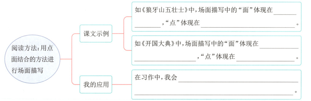 一、激烈的战斗 每位战士的具体表现 受阅部队经过天安门广场时整齐威武的情景 各个方阵的风采 运用点面结合的方法把场面描写得更加生动、形象
