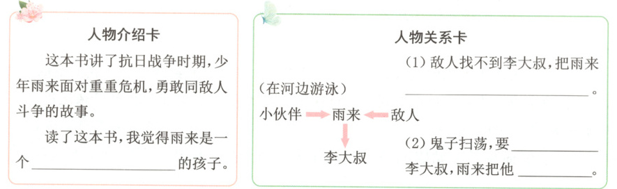 三、下面是小语为宣讲团成员制作的《小英雄雨来》“人物介绍卡”和“人物关系卡”,请按要求完成练习。