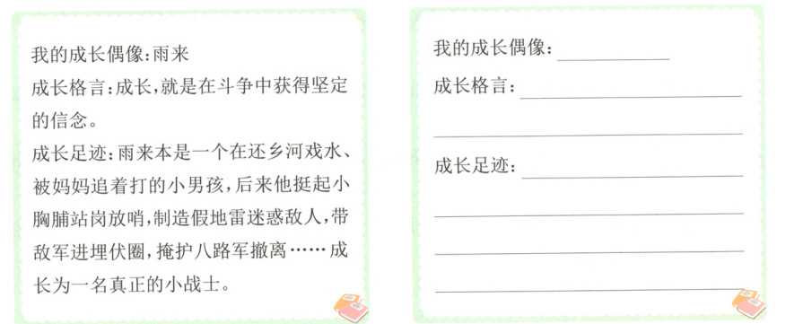现了雨来的孤独和勇敢;② 地里的干柴叶子不仅符合故事的环境设定,也是雨来埋信的必要元素,推动了故事情节的发展(每点1分,任意答出两点理由即可) 4. 示例:阿廖沙(1分) 成长,就是在恶劣环境中塑造乐观的性格。(1分) 阿廖沙生活在黑暗污浊的环境中,但他在坚强的外祖母的引导下,在乐观淳朴的小茨冈、正直的老工人格里高利、献身于科学的知识分子“好事儿”等人的影响下,保持对生活的勇气和信心,逐渐成长为一个坚强、勇敢、正直和充满爱心的人。(2分)(评分建议:选择符合题干主题的图书人物,得1分;写出符合人物经历的成长格言得1分;写出与人物相关的成长足迹得2分。)