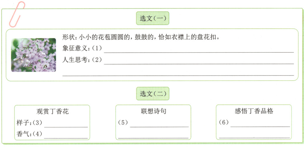 四、1. 丁香花(1分) 2.(1)丁香结自古以来就负担着解不开的愁怨。 (2)既然人生难免遇到挫折、困难,那不妨用乐观豁达的心态面对,积极解决问题,并把它看作一种人生的味道。 (3)花小如丁。 (4)浓郁。 (5)“五月丁香开满城,芬芳流荡紫云藤。”“芭蕉不展丁香结,同向春风各自愁。” (6)丁香花聚小而成大器,抗艰难而争上游,坚忍、顽强、生机勃勃。(每空1分)