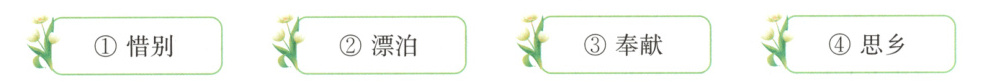 五、1. ① 2. ③ 3. ④ 4. ② 解析:诗词中的意象是客观物象经过创作主体融入独特情感而创造出来的一种艺术形象。“杨柳”的“柳”与“留”谐音,柳条随风摇动,像极了亲友依依不舍招手的样子,因此古人在送别时,会折柳相送,杨柳变成了“留恋”“惜别”的代名词。蜡烛在燃烧过程中会不断熔化,最终燃尽,却在黑暗中为人们带来光明,常代表“无私奉献、不求回报”的精神。诗词中的月亮往往是“思乡”的代名词,月圆可喻团聚,月缺可喻分离,望月思乡在诗词中很常见。浮萍是一种水生植物,漂浮在水面,寓意随波逐流,在诗词中常用来比喻漂泊不定的人。