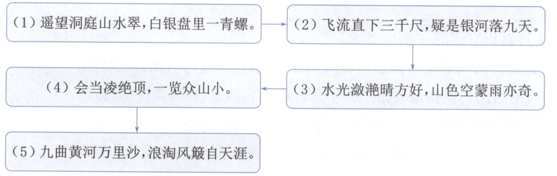 1.(1)洞庭湖 (2)庐山 (3)西湖 (4)泰山 (5)黄河 2. 示例:同学们,中国是一个诗的国度,中华诗词是民族文化的瑰宝,是一朵瑰丽的文学奇葩,特别是古典诗歌,佳作如林,名家辈出,在中国文明史上蔚为壮观。今天,让我们一起漫步古诗苑,驰骋想象,与陶渊明“东篱采菊”,与李清照“双溪泛舟”,与李白“举杯邀明月”,与苏轼“把酒问青天”……让我们一起漫步在这个色彩缤纷的世界,在鸟语花香中,品味古人的闲情逸致;在诗情画意中,感受他们的旷达胸襟吧!