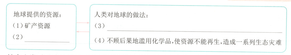 地滥用化学品,不但使它们不能再生,还造成了一系列生态灾难,给人类生存带来了严重的威胁。1. [阅读要素]地球为人类提供了哪些资源?人类又是怎样对待地球的?根据选文内容填一填,并完成练习。(3 分)