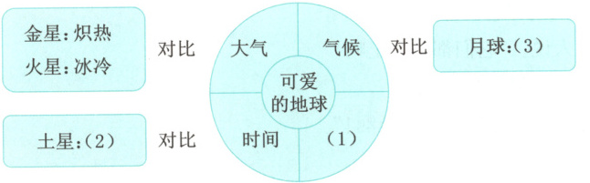 。围绕这个观点,作者讲了地球的许多优点。照样子,把下面的优点补充完整。(4 分)(1)有宜人的气温变化