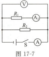 8. 【教材素材题】如图17-7所示的电路,闭合开关S,电流表A的示数为0.5 A,电流表$A_1$的示数为0.3 A,电压表V的示数为3 V,则通过电阻$R_2$的电流为 A,电阻$R_2$两端的电压为 V,电源电压为 V。