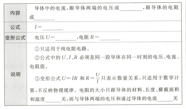 考点一 正比 反比 $\frac{U}{R}$ $IR$ $\frac{U}{I}$ 有 无
