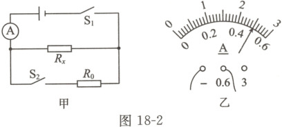 例1 开关模型 如图 18-2 甲所示的电路,电源电压恒定不变,$R_0 = 18\ \Omega$。只闭合开关 $S_1$ 时,电流表的示数为 0.3 A;开关 $S_1$、$S_2$ 均闭合时,电流表示数如图乙所示。则电源电压为 _______ V,$R_x =$ _______ $\Omega$。
