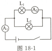 2.(2024滨州)如图18-1所示电路,电源电压为$3V$,闭合开关后,电流表$A_1$的示数为$0.6A$,电流表$A_2$的示数为$0.2A$,则通过灯泡$L_2$的电流为_______$A$,灯泡$L_1$的阻值为_______$\Omega$。