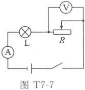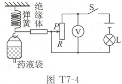 2. 每当换季的时候诊所都会比较忙,为此小梦帮妈妈设计了如图 T7-4 所示的输液提示器电路图,其中电源电压恒为 6 V,$R$为滑动变阻器,其规格为“20 Ω 1 A”,$L$为标有“5 V 2.5 W”的小灯泡,灯丝电阻不变,电压表测量范围为 0~3 V。在输液过程中,为保护电路中所有元件的安全,下列说法中正确的是