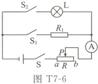 4. (2025 乐山)如图 T7-6 所示,电源电压恒定,灯泡 L 标有“6 V 6 W”字样(忽略温度对灯丝电阻的影响),滑动变阻器$R$的最大阻值为 20 Ω。当$S$、$S_1$、$S_2$均闭合,滑动变阻器滑片移至$a$端时,灯泡正常发光,此时电流表示数为 1.6 A。求: