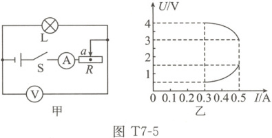 3. (2024 广安)如图 T7-5 甲所示电路,电源电压恒定不变,电流表测量范围是 0~0.6 A,电压表测量范围是 0~3 V。闭合开关 S,在滑动变阻器$R$的滑片从最右端向左滑到 a 点的过程中,滑动变阻器$R$和灯泡$L$的$U-I$图像如图乙所示,当滑片在 a 点时灯泡$L$恰好正常发光。下列说法正确的是