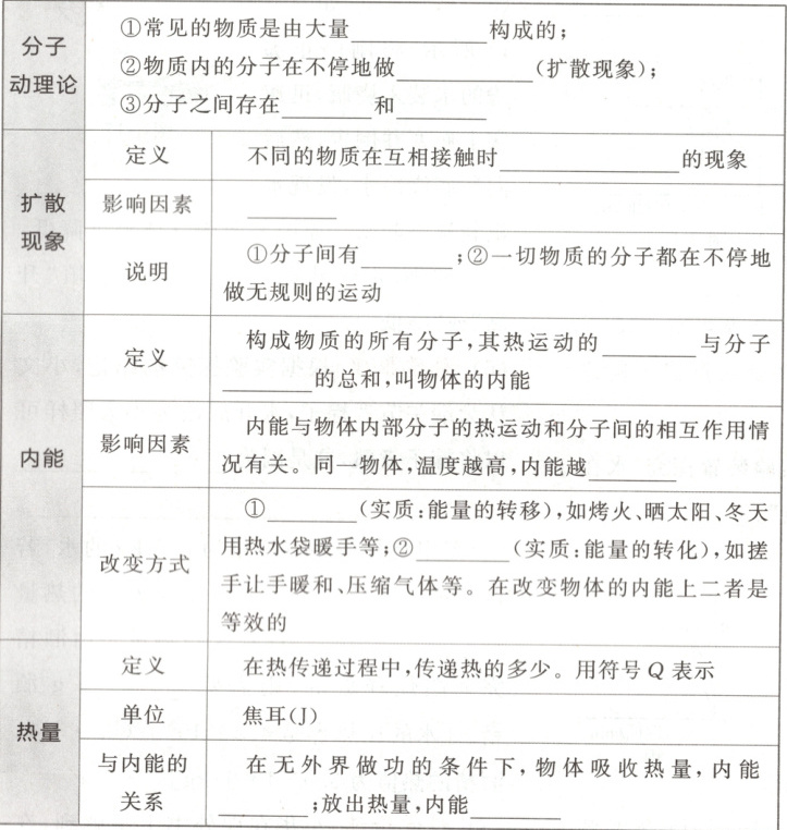 考点一 分子 热运动 引力 斥力 彼此进入对方 温度 间隙 动能 势能 大 热传递 做功 增加 减少