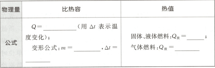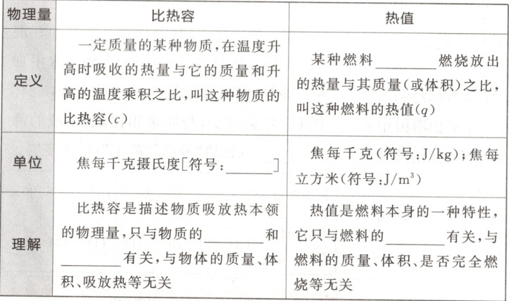 考点二 完全 J/(kg·℃) 种类 状态 种类 $cm\Delta t$ $\frac{Q}{c\Delta t}$ $\frac{Q}{cm}$ [注意] $4.2×10^{3}$ J/(kg·℃)