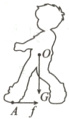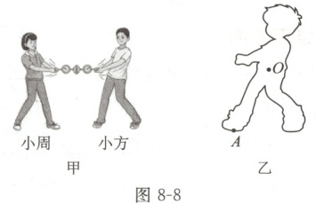 例5 (2025 成都) 图 8-8 甲是小周和小方模拟马德堡半球实验的示意图。他们对半球施加力的方向相反且作用在同一水平直线上, 此时他们相对地面静止。图乙中, O 点是小方的重心, A 点为小方前脚所受地面摩擦力的作用点。请在图乙中画出: ①小方所受重力 G 的示意图; ②小方前脚所受摩擦力 f 的示意图。