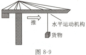 例6 工程机械 (2025 菏泽) 如图 8-9 所示, 塔吊的水平运动机构用钢丝绳悬挂着货物一起沿水平方向向前匀速运动, 水平运动机构突然停止时, 货物 (