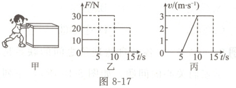 例17 图像模型 (2024 凉山州) 如图 8-17 甲所示, 置于水平地面上的物体受到方向不变的水平推力作用, 其 F-t 和 v-t 图像分别如图乙和图丙所示。由图像可知, 10~15 s 内物体做