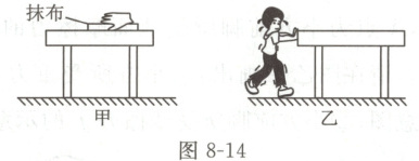 例14 水平方向 (2025 泸州) 小复周末参加家庭劳动。如图 8-14 甲所示, 他用抹布向左擦拭桌面时, 抹布受到桌面的摩擦力方向向
