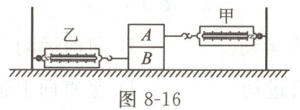 例16 叠加模型 (2025 凉山州) 如图 8-16 所示, 保持物块 A 与 B 位置不动, 缓慢向两侧移动铁架台, 整个装置静止后, 弹簧测力计甲、乙的示数分别为 5 N 和 3.5 N, 则 A 所受摩擦力的方向水平向
