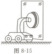 例15 竖直方向 (2025 遂宁) 玻璃厂常利用电动真空吸盘搬运玻璃。图 8-15 中搬运车上的吸盘吸附一块质量为 180 kg 的玻璃, 让其在空中竖直静止。此时玻璃受到的摩擦力方向竖直向