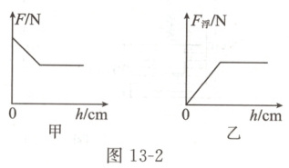 5. 对$F-h$图像(如图13-2甲所示)、$F_{浮}-h$图像(如图乙所示)的分析:随着物体逐渐浸入液体中,弹簧测力计的示数不断