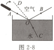 例 6(2024 广元)“追梦”学习小组的同学用激光笔发出一束红光从空气斜射入水中的情境如图 2-8 所示,图中 AO 为入射光线,