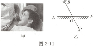 例 9(2025 成都)图 2-11 甲是医生通过平面镜观察患者口腔的情景。如图乙所示示意图中,EF 为平面镜,B 点为医生眼睛所在位置,A′ 表示医生通过平面镜看到患处 A 的像点,O 点为入射点,OB 为反射光线。请在图乙中完成作图:①根据平面镜成像特点画出 A 的位置;②画出入射光线 AO。(保留作图痕迹)
