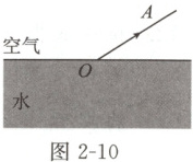 例 8(2025 凉山州)如图 2-10 所示,一条光线从空气斜射向水面时发生了反射与折射,OA 为反射光线。请在图中画出:(1)入射光线;(2)折射光线的大致位置。