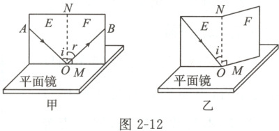 光线角度的变化,同时比较反射角与入射角的大小。4. 如图乙所示,将纸板$F$沿法线$ON$向前折或向后折,在纸板$F$上