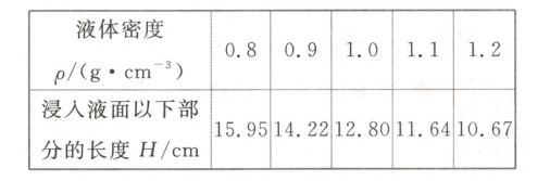 (4) 将直杆放入密度已知的不同液体中,当直杆在液体中稳定竖直漂浮时,在直杆上液面所在的位置做标记,并测量出直杆浸入液面以下部分的长度 $ H $;将数据记录在下表中,并将对应的密度值标注在直杆上,制成密度计;