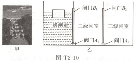 5. 工程机械(2025 长春)三峡船闸是世界上最大的船闸。如图 T2-10 甲所示,船在船闸中要经过五个闸室,实现船体的逐次降低或升高。实践小组制作的船闸模型如图乙所示,用两个隔板把大鱼缸分成三个长方体容器,每个容器内的底面积均为$500\ cm^2$,隔板上均安装了闸门和阀门(体积均忽略不计),用重为6\ \text{N、底面积为$200\ cm^2$的不吸水的长方体木块代替船。“工作过程”如下:将船闸模型放在水平桌面上,关闭所有阀门、闸门后,向一级闸室内倒入适量的水,木块放入水中静止后,漂浮在水面上。打开阀门$A_1$,当一、二级闸室水面相平后,打开闸门$B_1$,将木块缓慢推入二级闸室。关闭$A_1$和$B_1$,打开阀门$A_2$,当二、三级闸室水面相平后,打开闸门$B_2$,将木块缓慢推入三级闸室。[新教材]