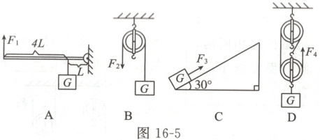 比较$F_{1}=\frac{G}{4}$,$F_{2}=G$,$F_{3}=\frac{G}{2}$,$F_{4}=\frac{G}{3}$的大小,$\frac{G}{4}<\frac{G}{3}<\frac{G}{2}<G$,所以最省力的是A。