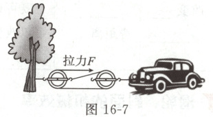 例 3 一辆质量是$2 × 10^{3} kg$的汽车不慎陷入泥泞地面,汽车司机组织人们用如图 16-7 所示的滑轮组将汽车拖出。已知整个过程中,水平拉力$F = 600 N$,汽车沿水平方向匀速移动了$3 m$,不计机械自重和摩擦,汽车受到的阻力大小为_______$ N$,绳端移动的距离为_______$ m$。