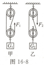 例 4 将规格相同的滑轮,用绳子绕成如图 16-8 所示的甲、乙两滑轮组。使用甲、乙两滑轮组分别匀速提升所受重力为$G_1$、$G_2$的两物体,使其升高相同的高度。绳子自由端施加的拉力大小分别为$F_1$和$F_2$,物重$G_1 > G_2$,不计绳重和摩擦。下列判断正确的是( )