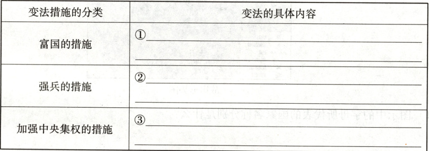 (1) ①废除旧的土地制度;鼓励耕织,生产粮食、布帛多的人可免除徭役;统一度量衡;②奖励军功,对有军功者授予爵位并赏赐土地;③确立县制,由国君直接派官吏治理;废除贵族的世袭特权;建立户籍制度,加强对人民的管理;严明法度,禁止私斗。