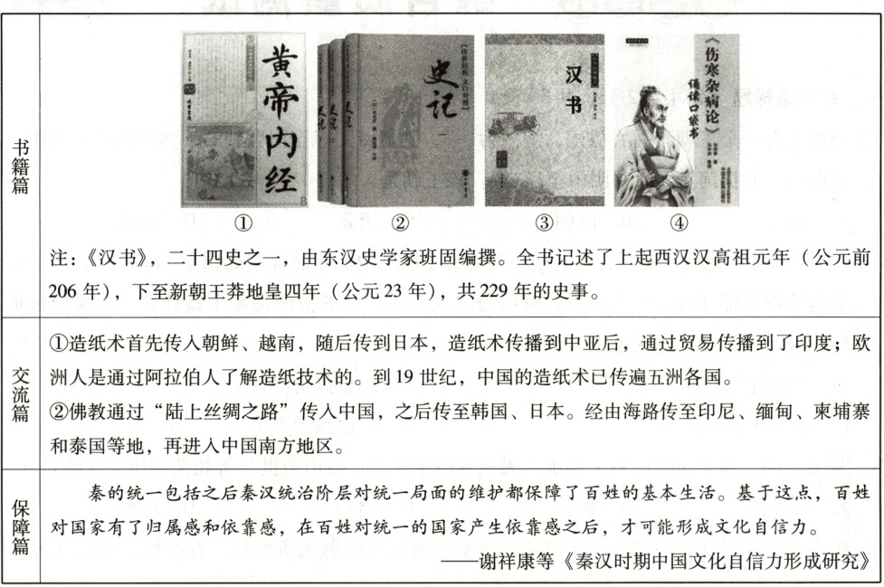 (1)①④都是医学著作,②③都是史书。《史记》是我国第一部纪传体通史,《汉书》是我国第一部纪传体断代史。