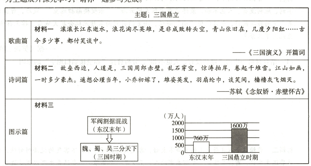 (2)材料二中“三国”指哪三国?材料二与我国古代历史上哪一著名的战役有关?请说出这次战役的时间、交战双方及战役的结果。“周郎”指的是谁?