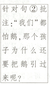 2. 针对句②的批注:“我们”都怕鹅,那个孩子为什么还要把鹅引过来呢?是从哪个角度作的的?(3分) ()