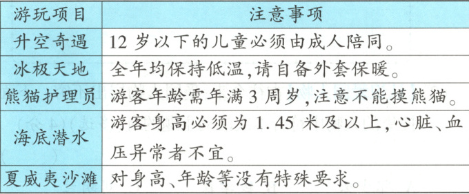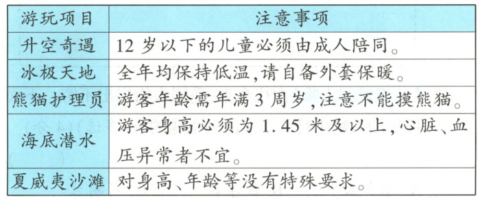 示例:①去玩“冰极天地”的时候记得带上外套保暖;②爷爷患有高血压,不能玩“海底潜水”项目,建议玩其他项目。