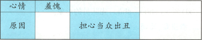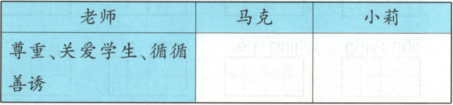 1. 火冒三丈 荣誉 清脆 热烈 2. C 3. |心情|羞愧|惊慌、不安|吃惊、感动| | ---- | ---- | ---- | ---- | |原因|知道玩笑开大了,伤害了小莉和老师|担心当众出丑|没想到小莉会发现并写出自己那么多的优点| 4. 示例:马克:爱劳动、乐于助人 小莉:宽容、善良 5. 示例:我觉得马克会改变。当小莉读出马克的优点时,马克哭了起来,可见他的内心受到了触动;当听完老师的一番话后,他鼓掌“鼓得尤其用力”,可见他认同老师的话。因此,我觉得经过这件事,马克会有所改变,不再那么调皮,会让自己的优点更加突显,也会为班级团结而努力。