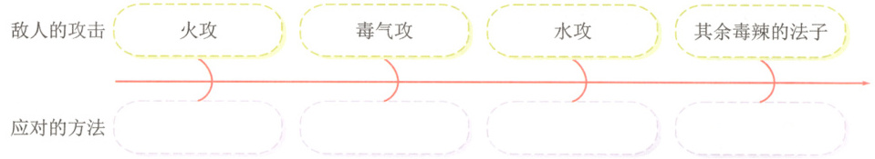 ① 敌人尝到了地道的厉害,想方设法来破坏,什么火攻啊,水攻啊,毒气攻啊,都用遍了。大家又想出了许多妙法来防备。洞口准备着土和沙,可以用来灭火。“孑口”上装着吊板,如果敌人放毒气,就把吊板放下来挡住,不让毒气往里透。对付水攻的法子更妙了,把地道跟枯井暗沟连接起来,敌人放水的时候,水从洞口进来,就流到枯井暗沟里去了。任敌人想出什么毒辣的法子也不怕,因为各个村子的地道是相通的,大不了转移到旁的村子去。
