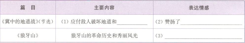 1.人们想出“无线电”和“有线电”的办法来了解地面上的情况(2分) 2.准备土和沙灭火 放下吊板挡住 把地道与枯井暗沟连接 各村相通,大不了转移到旁的村子去(每空1分) 3.狼牙山是爱国主义教育基地 狼牙山是国家级森林公园(每空1分) 4.示例: