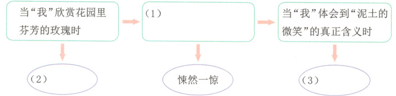3. C(3分) 解析:结合第③自然段中“朋友急忙拦住,高声叫着:‘不可,不可!这么美丽的玫瑰剪下来,让人心疼。’她抓紧我的袖子叮咛:‘千万不能剪啊,玫瑰是泥土的微笑,谁忍心杀戮美得醉人的微笑?’”,第④自然段中“丑陋的泥土,卑微的泥土,朴素的泥土,因为玫瑰,露出了惊艳一笑。因为这一笑,让人爱惜非常”可知,让“我”的灵魂悚然一惊的原因:泥土虽然丑陋、卑微、朴素,但是它的“微笑”是美丽、华贵、流光溢彩的,“我”从好友的话中体会到了泥土因玫瑰而美丽,玫瑰因泥土而真实,所以“我”的灵魂悚然一惊。