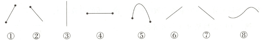一、下面的图形,哪些是直线?哪些是射线?哪些是线段? (填序号)(6分)