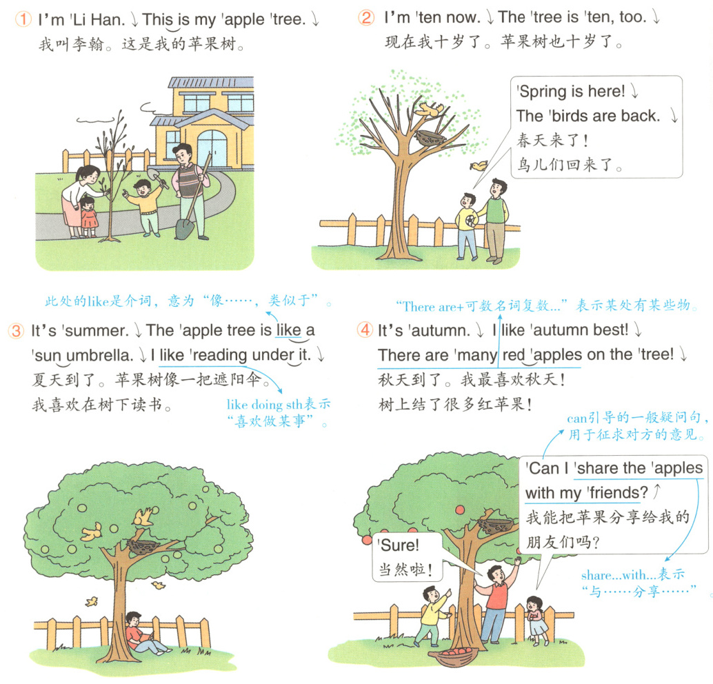 under it.2 夏天到了!苹果树就像一把太阳伞。我喜欢在它下面