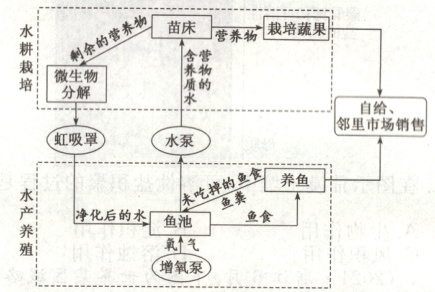 (1)题,结合材料,从水产养殖和水耕栽培两方面分析回答两者之间的水及水中物质的循环过程。第
