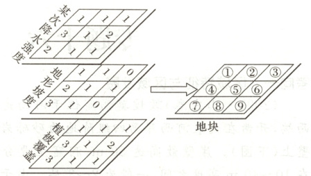 11. (2021·浙江6月)GIS可通过图层信息来分析和预测地质灾害的发生。下图示意某区域相关要素评估值信息图层(数值越大表示该评估要素指示地质灾害发生概率越高)和地块编号。完成此次降水易引发地质灾害的地块是 (
